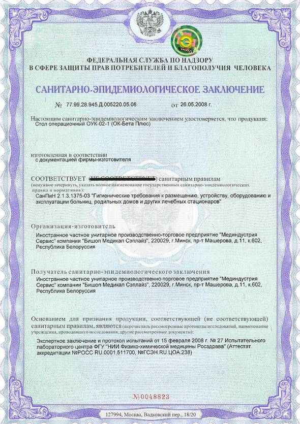 ………… Санитарно-эпидемиологическое заключение № 77.99.28.945.Д.005220.05.08