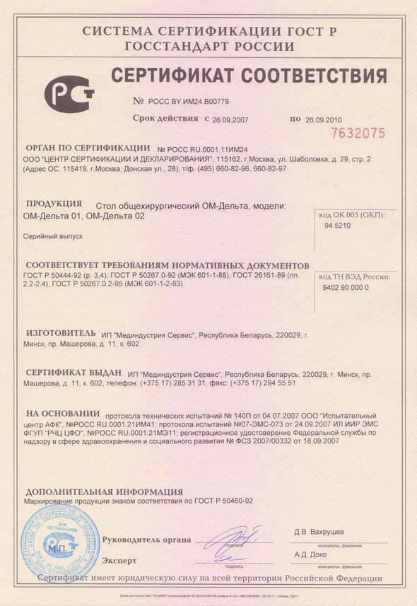 • Технические характеристики. Стол операционный ОМ-Дельта 01