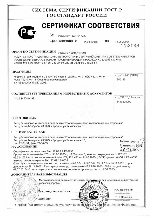………… Сертификат соответствия РОСС BY.РБ01.В17722