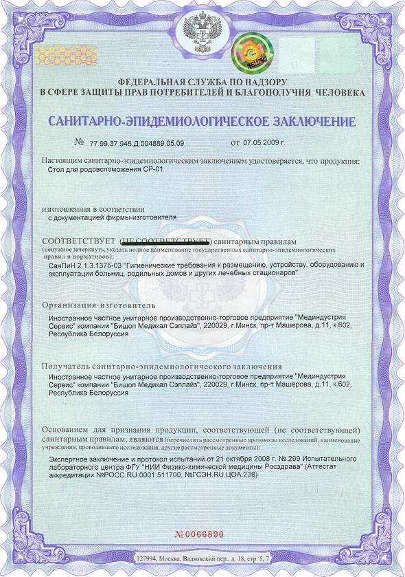 ………… Санитарно-эпидемиологическое заключение Стол для родовспоможения СР-01