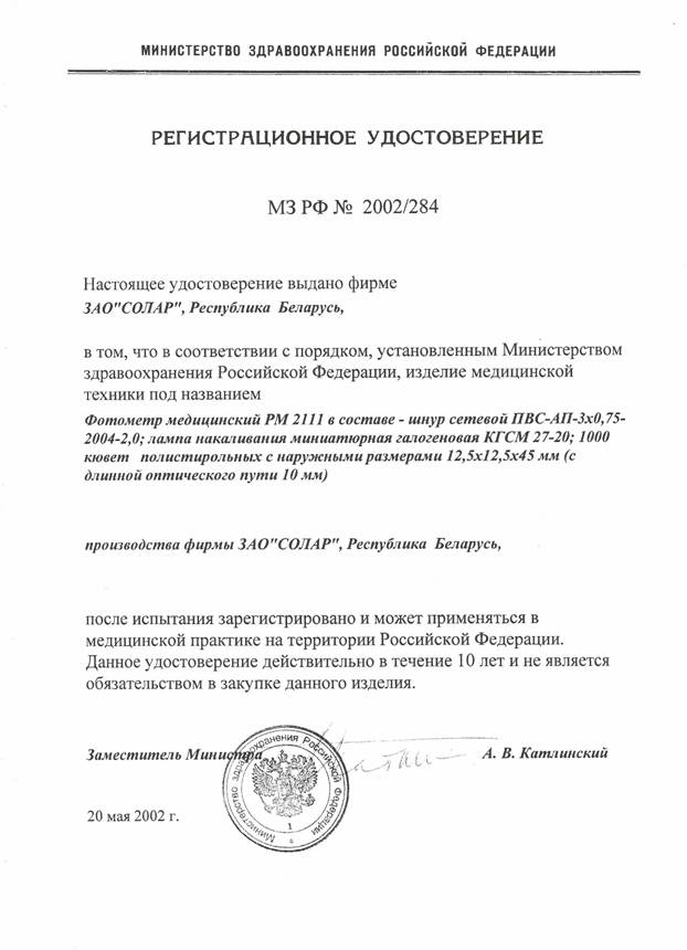 ………… Регистрационное удостоверение РФ фотометр РМ 2111