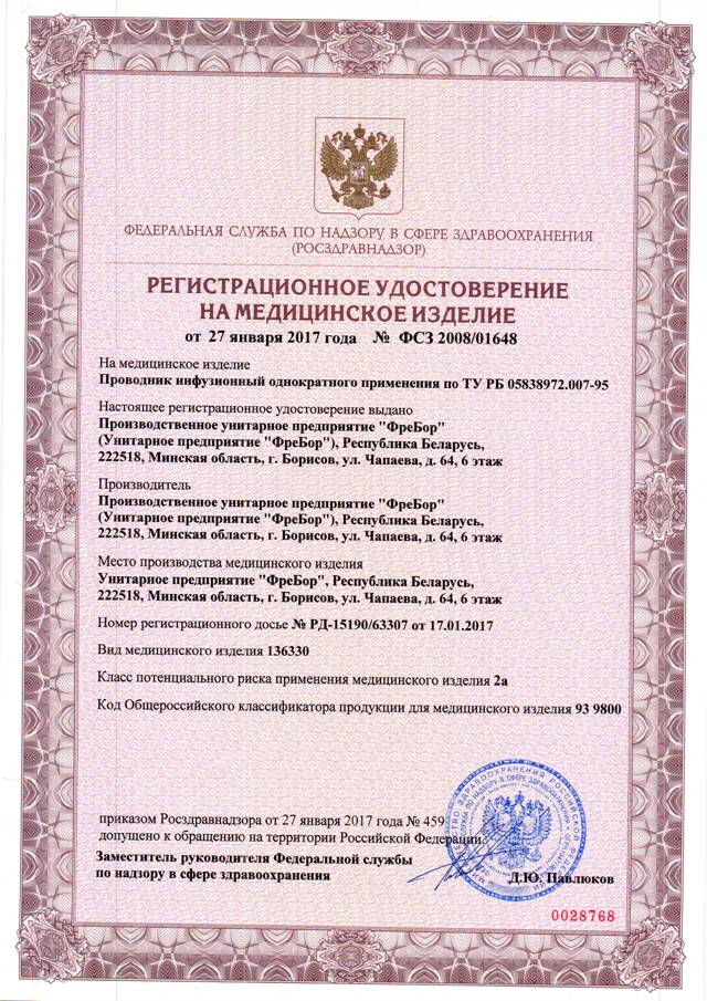 ………… Регистрационное удостоверение РФ на проводник инфузионный
