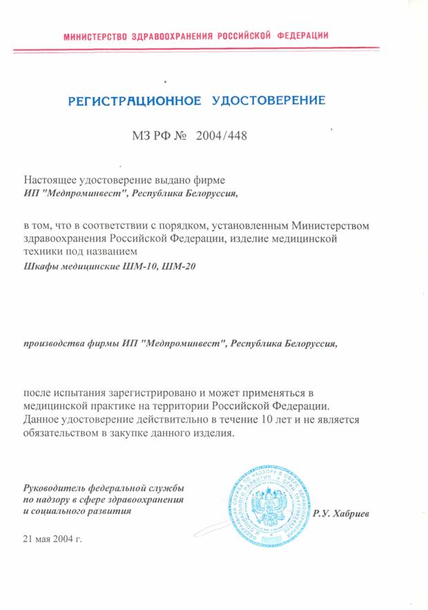 ………… Регистрационное удостоверение РФ на шкафы медицинские серий ШМ-10 и ШМ-20