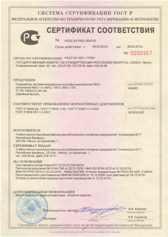 ………… Сертификат соответствия РФ на спирометр МАС-1