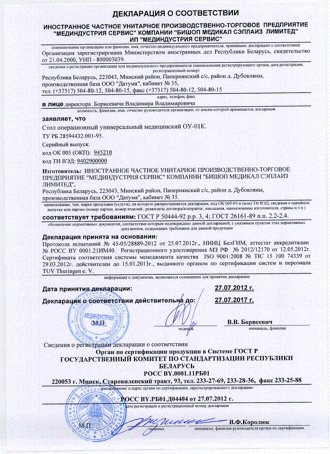 ………… Декларация о соответствии на стол операционный ОУ-01К (Медин-Альфа)