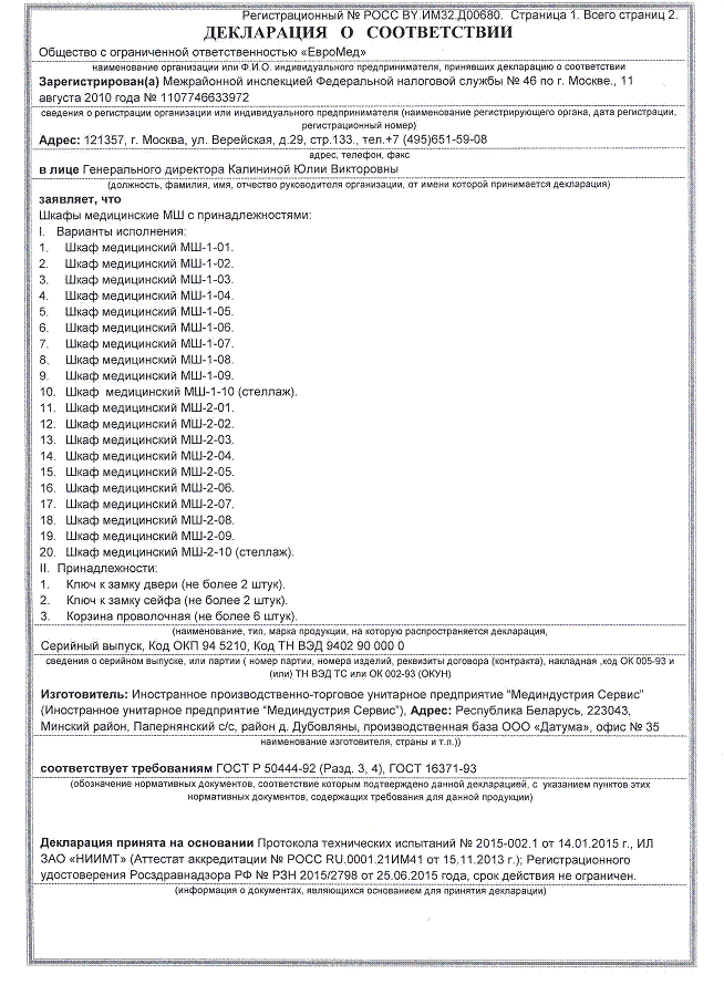 ………… Декларация о соответствии Шкафы медицинские серий МШ-1, МШ-2