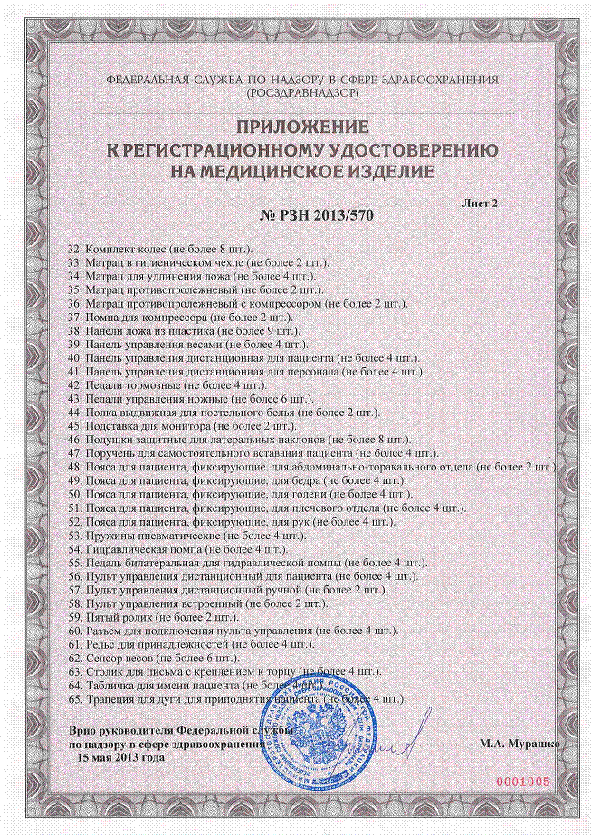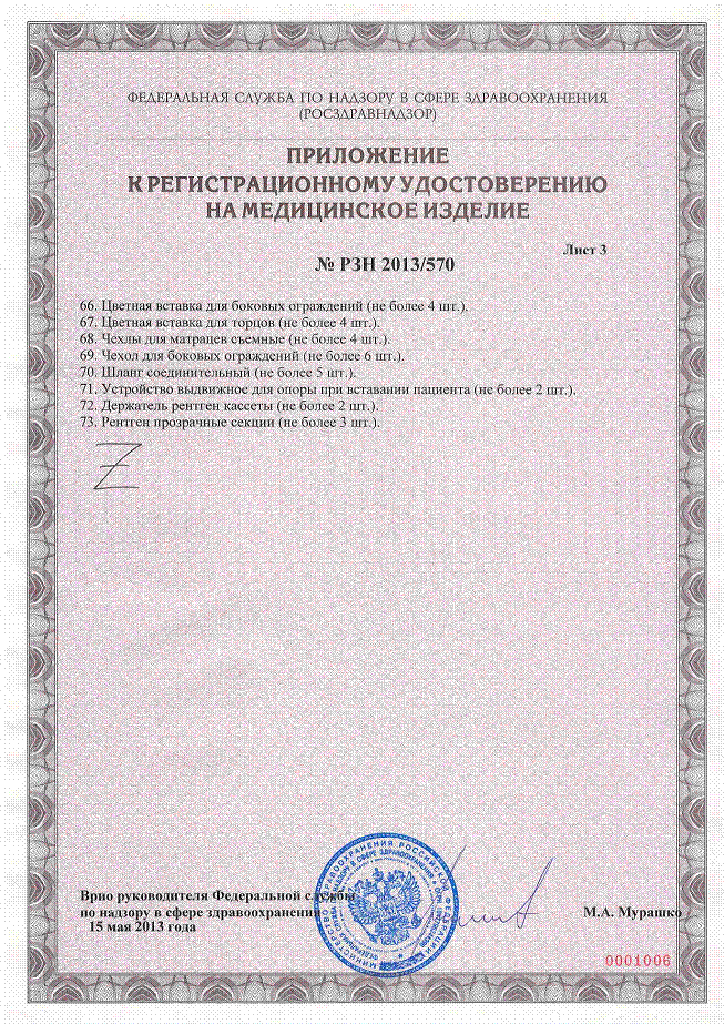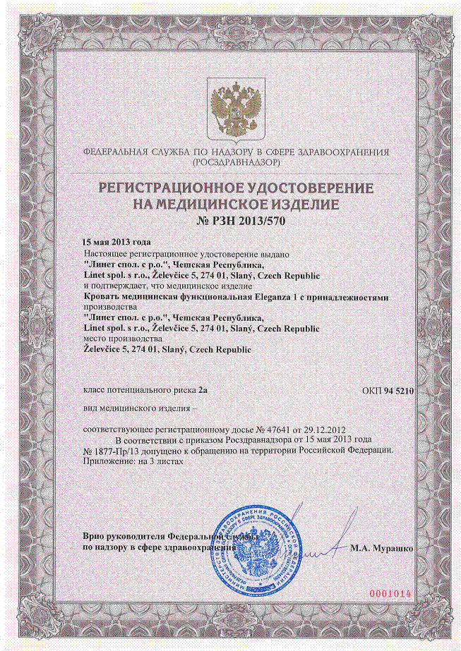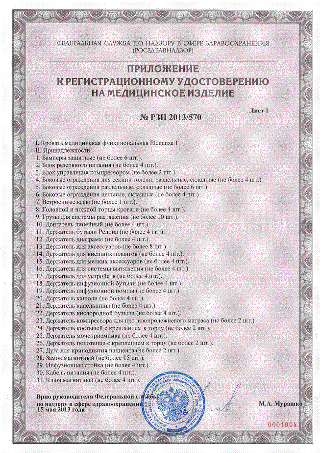 ………… Регистрационное удостоверение РФ Кровать медицинская функциональная Eleganza 1