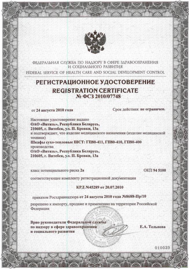 ………… Регистрационное удостоверение на шкафы сухо-тепловые ШСТ