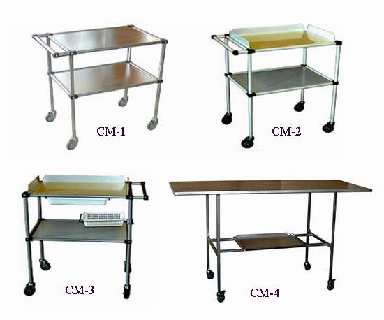 Столики медицинские СМ-1, СМ-2, СМ-3 предназначены для размещения медикаментов, инструмента, материалов в операционных и перевязочных отделениях или для их доставки в палаты в пределах больничного корпуса. Столики медицинские СМ-4 и СМ-5 предназначены для размещения стерильного инструментария в операционном зале.