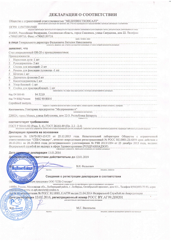 ………… Регистрационное удостоверение РФ на стол операционный ОН-20