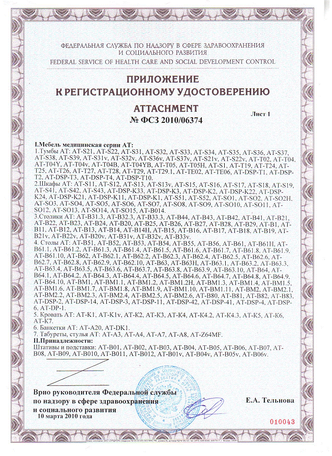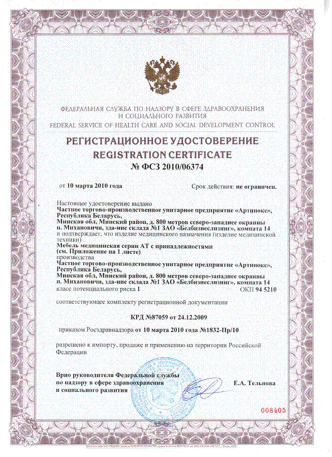 ………… Регистрационное удостоверение РФ на Мебель медицинскую серии AT