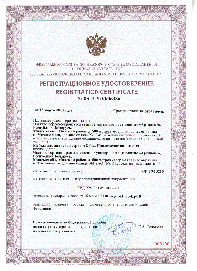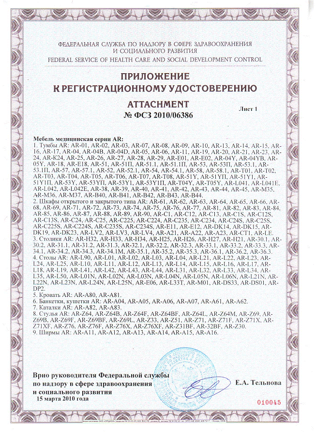 ………… Регистрационное удостоверение РФ на Мебель медицинскую серии AR
