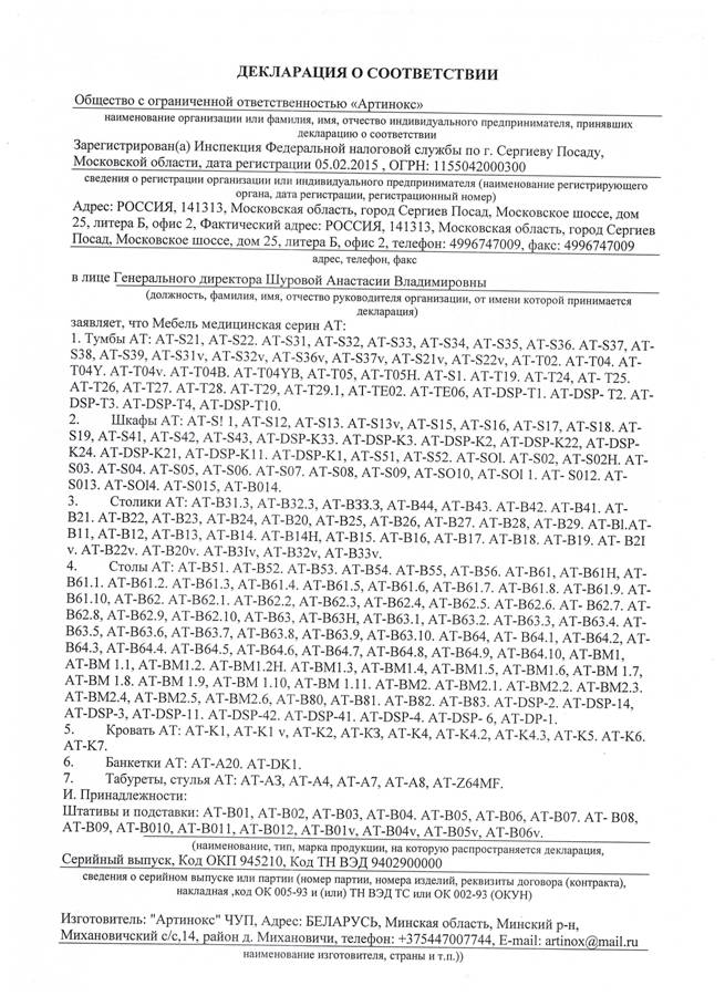………… Декларация о соответствии на Мебель медицинскую серии AT