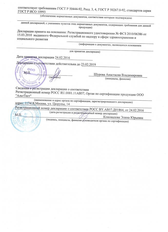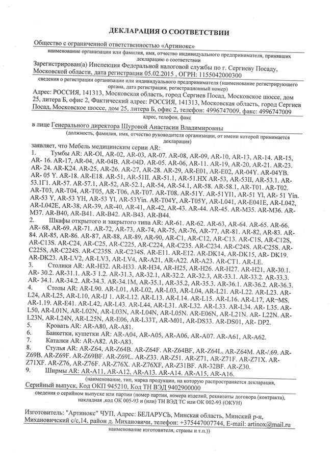 ………… Декларация о соответствии на Мебель медицинскую серии AR