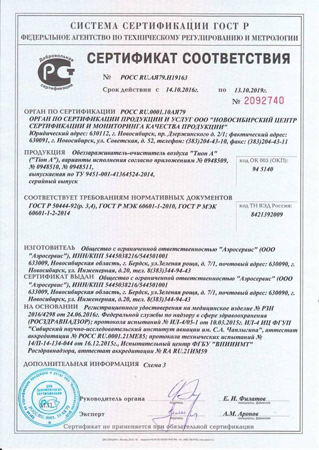 ………… Сертификат соответствия обеззараживатель "Тион А"