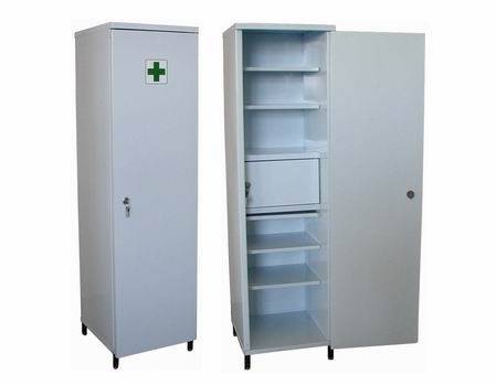 Шкафы изготовлены из листовой стали и покрыты экологически чистыми и химически стойкими эпоксидными порошкообразными красками, допускающими дезинфекцию любыми дезрастворами, применяемыми в медицине. Шкафы медицинские ШМ-10-1, ШМ-10-2, ШМ-10-3, ШМ-10-5 предназначены для хранения медикаментов, лекарственных препаратов, инструмента, перевязочных материалов, шкафы ШМ-10-4 предназначены для хранения одежды и обуви медицинского персонала. Шкафы могут устанавливаться вплотную друг к другу боковыми стенками. Двери при этом могут открываться на угол 105° в среднем шкафу и на угол 215° у крайнего шкафа. Запираются двери шкафов замком повышенной секретности. Шкафы ШМ-10-1, ШМ-10-2, ШМ-10-5 снабжены внутренней, запирающейся замком повышенной секретности, стальной секцией для хранения наркотических и ядосодержащих лекарств, а также выдвигающимся столиком для работы с лекарственными препаратами. Полки шкафов металлические (покрыты эпоксидными порошкообразными красками). На дверях шкафов ШМ-10-1 установлены съемные пластмассовые лотки. Шкафы ШМ-10-5 антресоль для увеличения количества полок и объема шкафа. При помощи регулируемых по высоте опор шкафы устанавливаются свободно на полу. По желанию заказчика возможна поставка шкафов с подвижными опорами качения. ТЕХНИЧЕСКИЕ ХАРАКТЕРИСТИКИ
