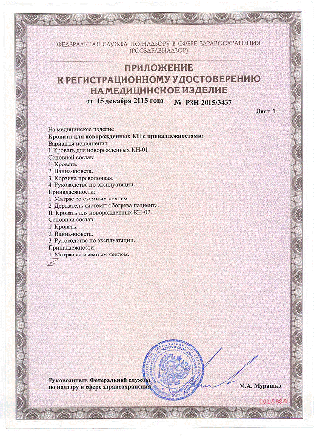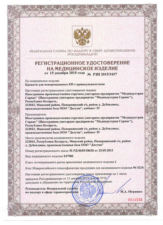 ………… Регистрационное удостоверение РФ на Кровать для новорожденных КН