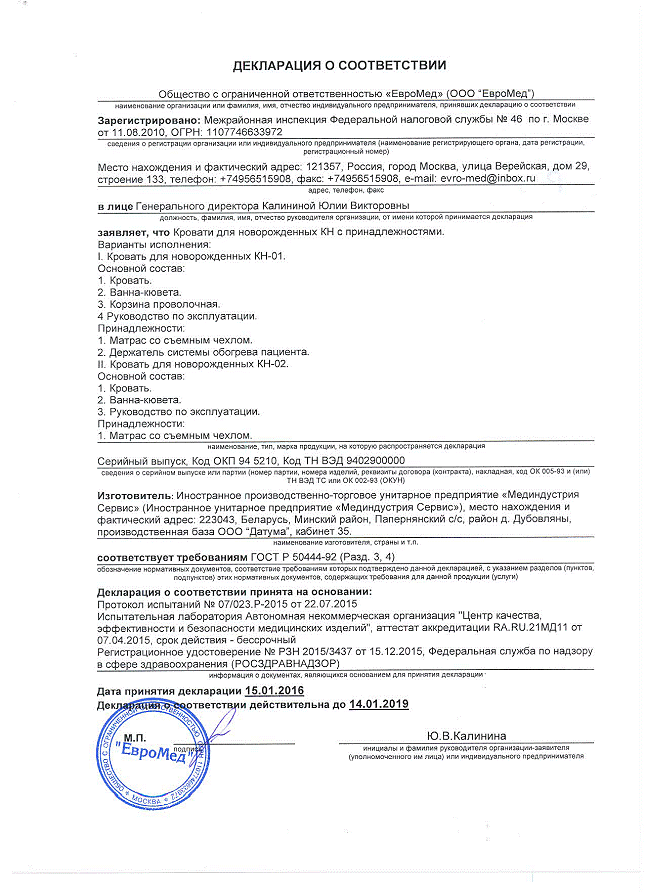 ………… Регистрационное удостоверение РФ на Кровать для новорожденных КН